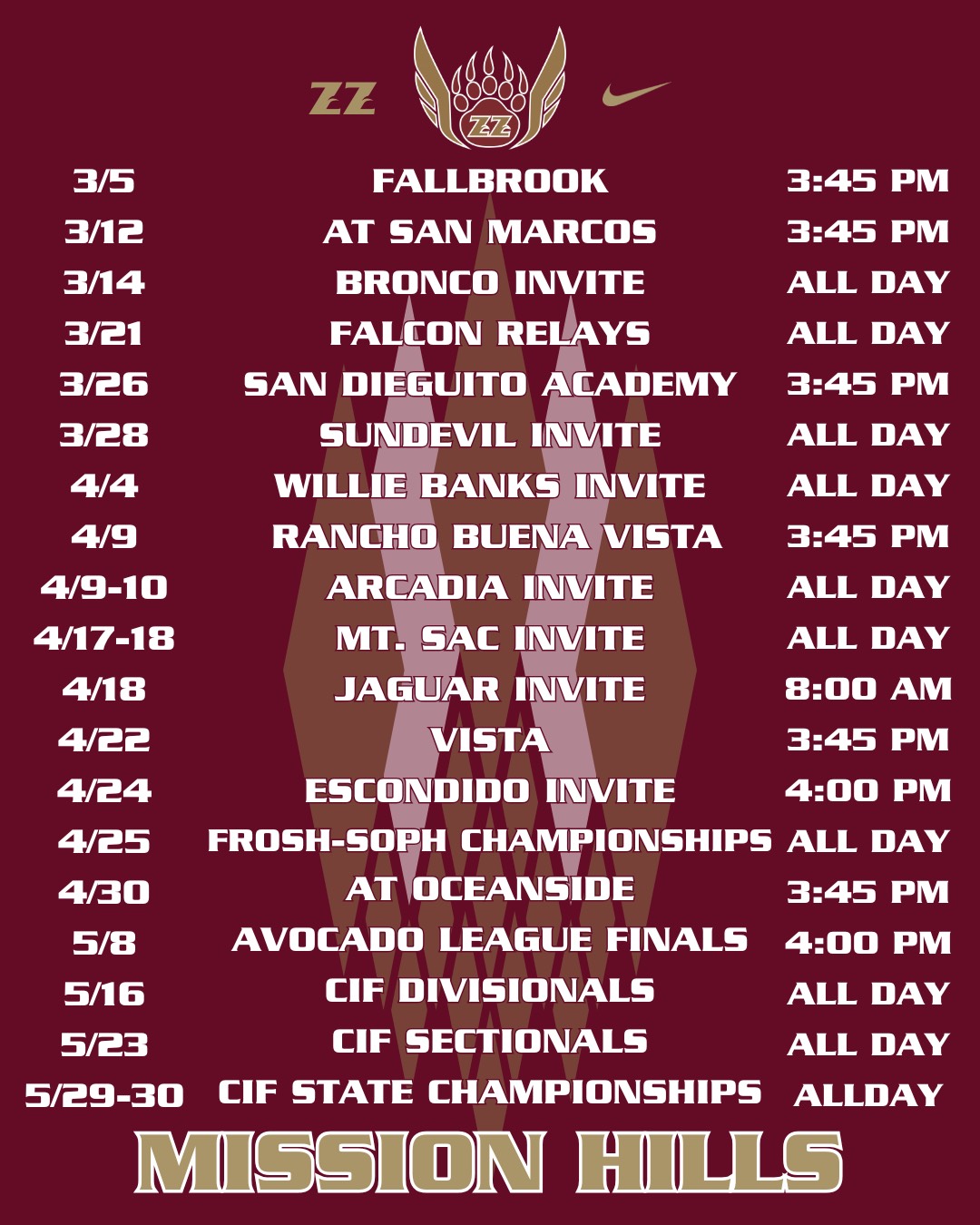 The Track Athlete/Parent Meeting is set for Wednesday Feb. 4 at 6 p.m. in the Mission Hills High School Library. No RSVP needed. Please join us to learn about our program and the upcoming season.